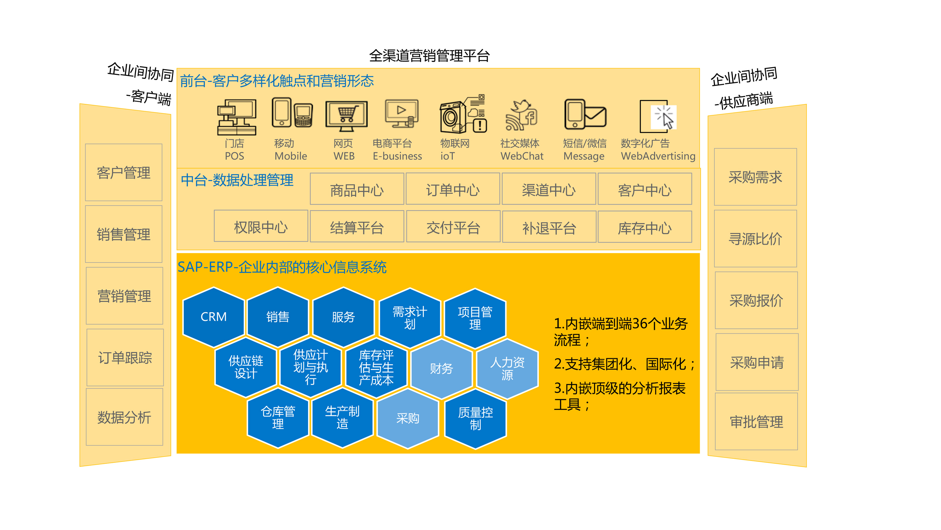 SAP® Business ByDesign® +Vstore的行业方案,解决企业从前端销售渠道搭建,经过中台统一数据中心处理、订单推送到ERP执行生产。前端销售系统和后台ERP系统无缝集成,解决了企业以销定产,产销协同