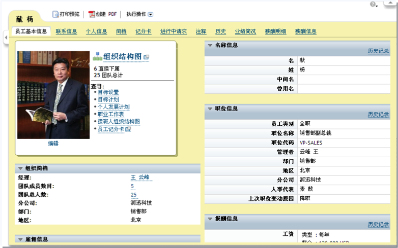 (2)全周期信息管理:对员工进入公司后的所有人力资源管理信息进行管理,包括入职,调动,晋升,出勤,目标和考核,薪酬调整,培训发展,继任者信息等。